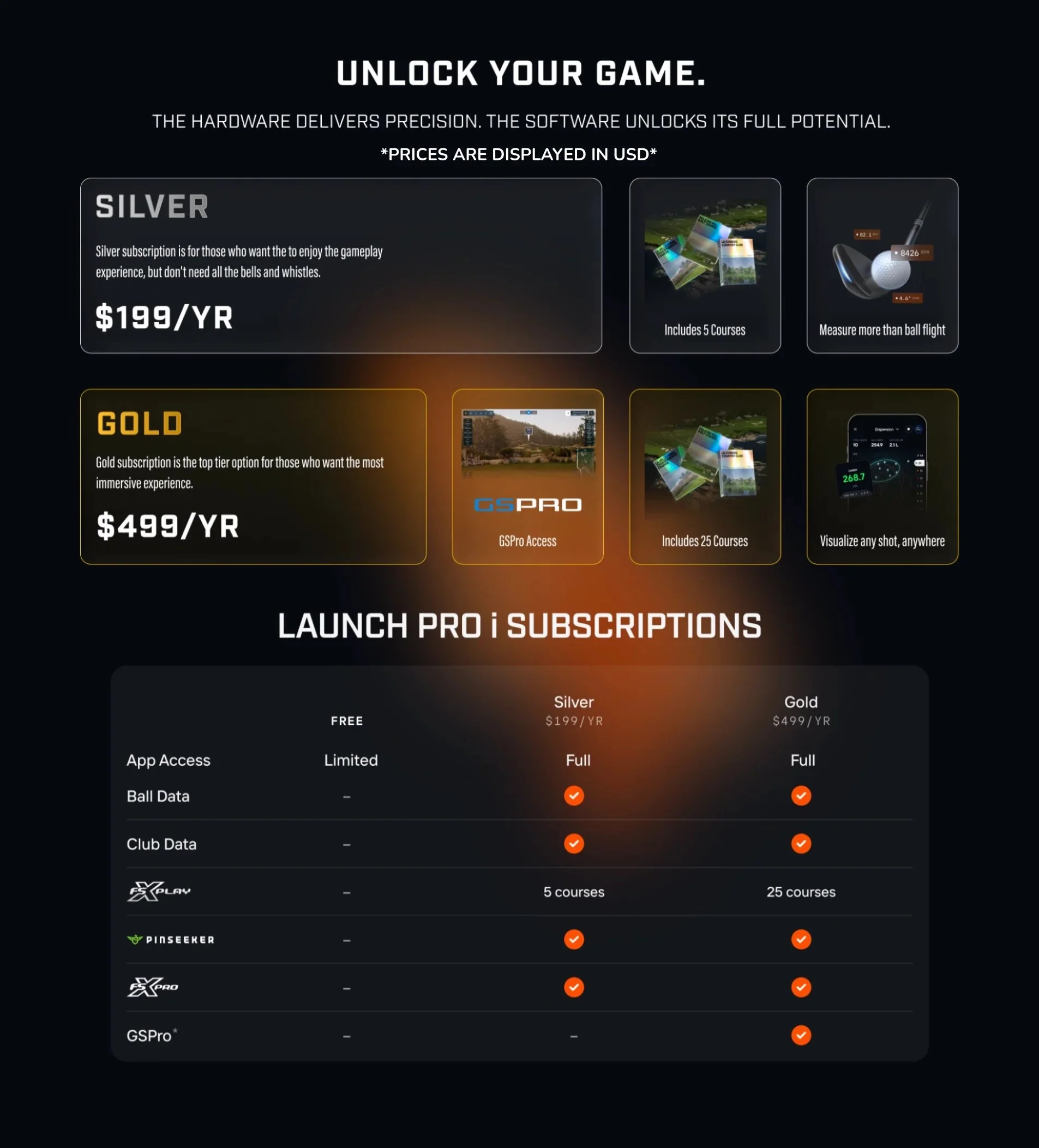Play your way with two software subscription offerings. Experience true-to-life gameplay with FSX Play, and in-depth data analytics with FSX Pro. Courses pre-selected by our staff, save sessions, create players, record unlimited unique clubs, track rounds, online game play and contests, 3D ball flight and more.*