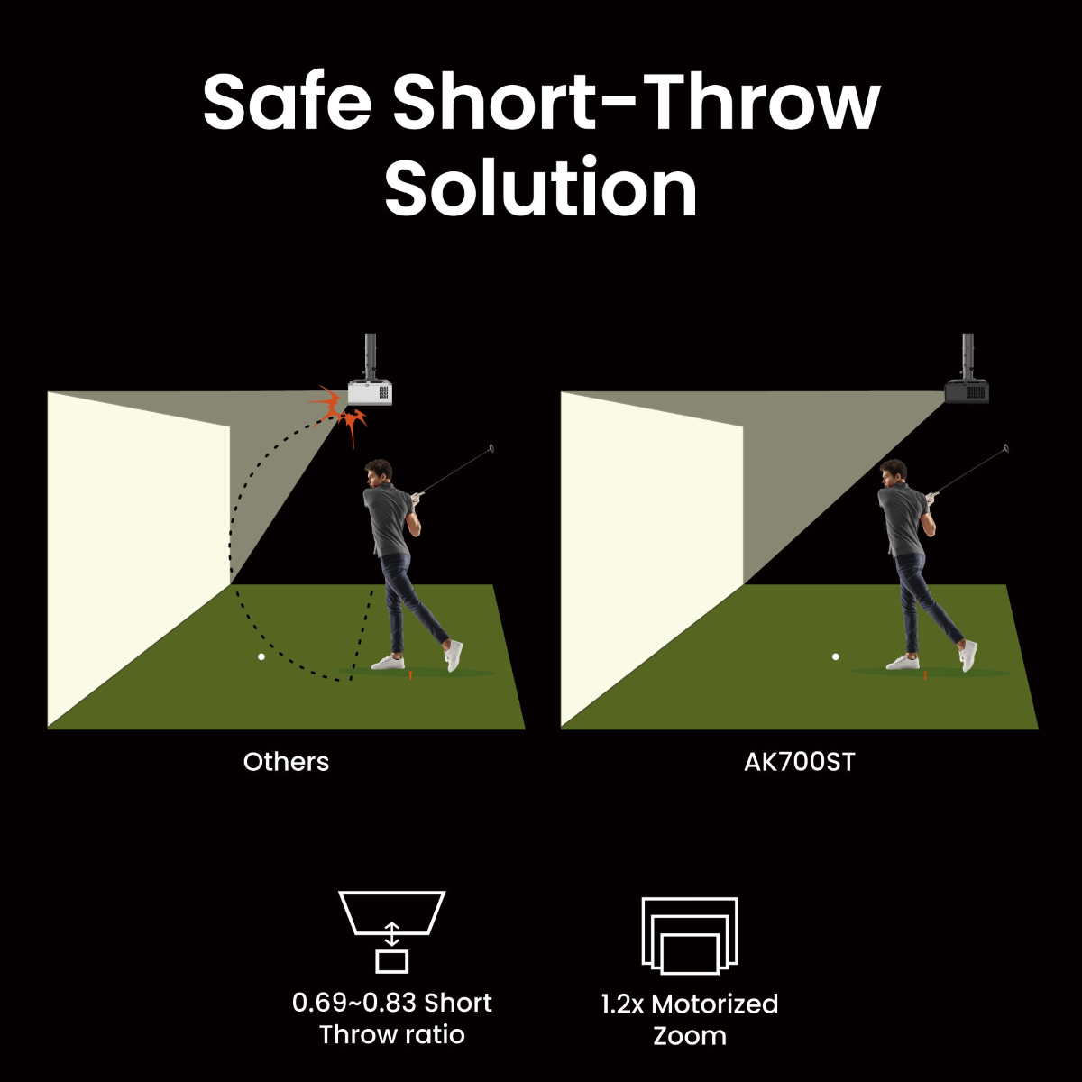 AK700ST features a professional-grade motorized lens with 1.2x optical zoom flexibility. Easily adjust screen size without reinstalling, ensuring no loss in picture quality.